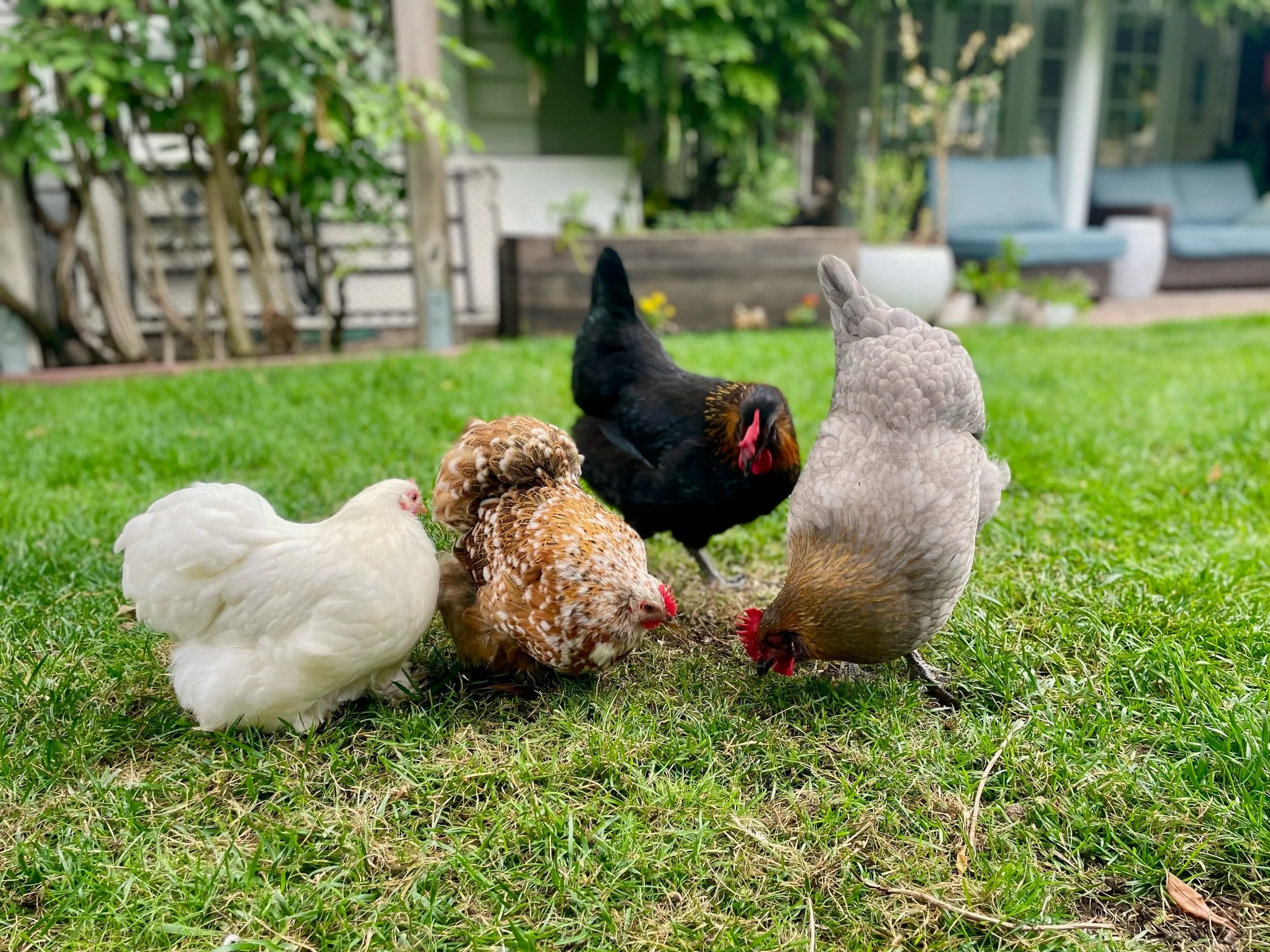 Meet my fabulous backyard flock—four charming hens who happily call my garden home. They spend their days scratching for bugs, fluffing up their feathers, quietly clucking and laying fresh eggs with great pride.